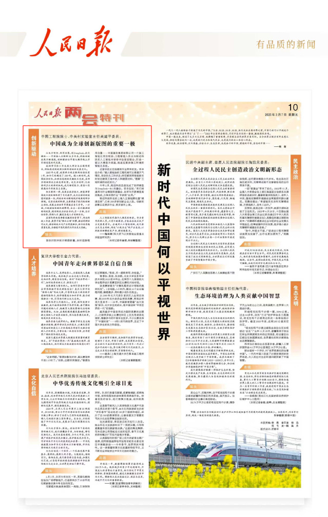 在2025年全国两会胜利召开之际,3月7日,《人民日报》“两会特刊”刊发全国政协常委、中国工程院院士、中关村实验室主任吴建平访谈报道《中国成为全球创新版图的重要一极》,内容如下。